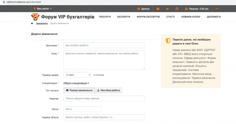— Тип послуги (разове замовлення, пошук фахівця на постійну роботу або конкурс)